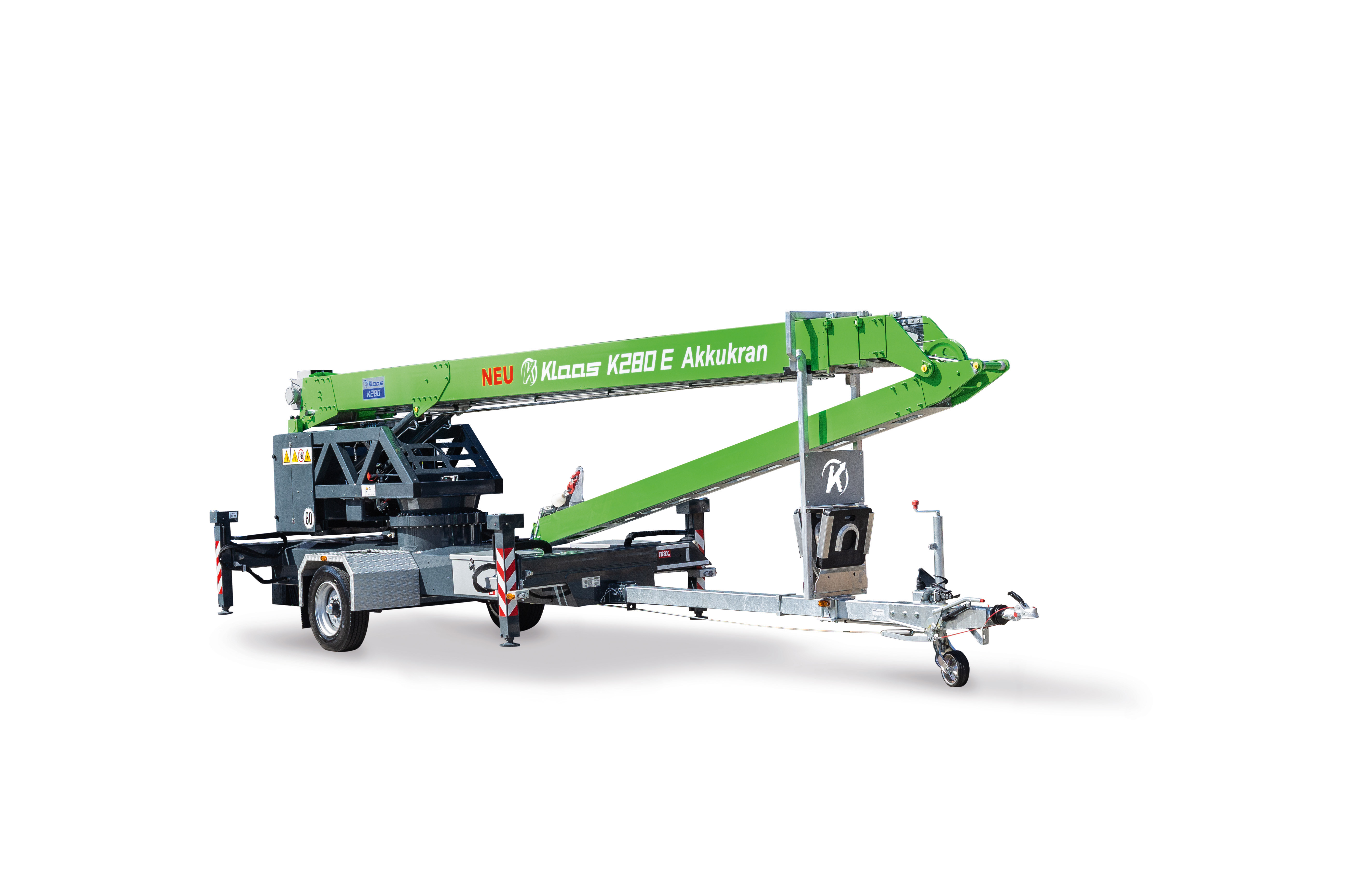 La grue sur remorque K280E est la plus petite de la gamme des grue tractables Klaas.