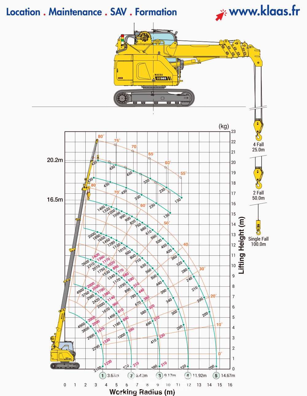 Sa portée de 16,5 mètres et sa capacité pouvant atteindre 4,9 tonnes en fond une grue mobile efficace. De plus que cette mini grue sur chenille peut se déplacer avec une charge de 2 tonnes.