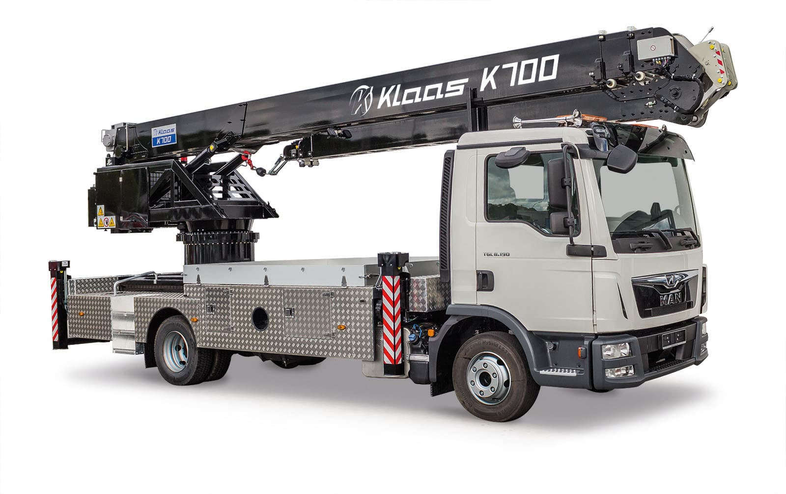 Le K700 permet le transport de charges de 250 kg jusqu'à des zones de travail distantes de 30 mètres. Doté d'une double flèche repliable hydrauliquement télescopique, il représente la grue idéale pour les environnements urbains.