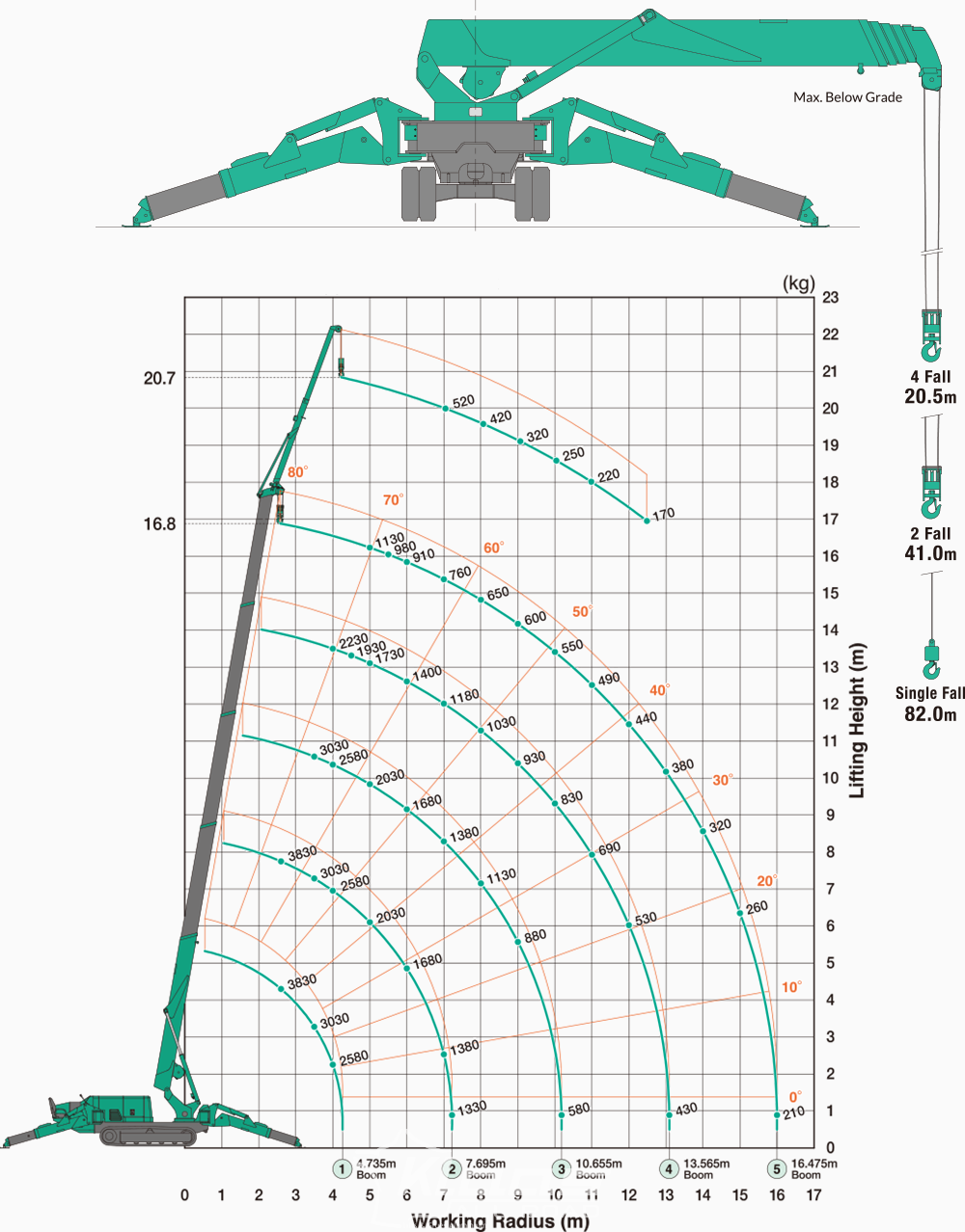 Capable d'effectuer un déplcement en charge, la mini grue araignée MC405 peut également être équipé d'une ralonge de JIB vous permettant d'atteindre une hauteur supérieur de 4 mètres.