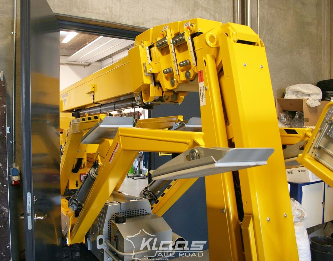 Une colonne montante articulée à double parallélogramme offre un dégagement de 7 m et permet de suivre le mur à la verticale.